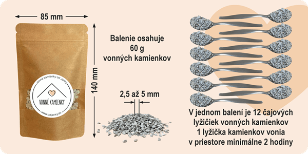 Balenie obsahuje 60 g vonných kamienkov, čo vystačí približne na 12 použití. Stačí jednoducho nasypať 1/2-1 čajovú lyžičku kamienkov do odparovacej misky aromalampy a zohriať ich pomocou čajovej sviečky. Vôňa sa bude uvoľňovať počas 2 hodín. Po vyprchaní vône môžete kamienky bez obáv vyhodiť do prírody. Podrobnejší popis nájdete aj v tomto článku. Naše kamienky sú ideálne na použitie v keramických a elektrických aromalampách.
